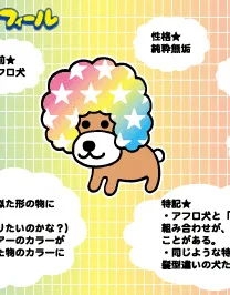 『アフロ犬』は、キャラクターグッズメーカーのサンエックスが生み出した人気キャラクター「アフロ犬」を主人公とするアニメーション作品である。アフロ犬は、虹色の豊かなアフロヘアーが特徴の犬で、常に明るく無邪気な性格をしている。新しいことへの挑戦を厭わず、好奇心旺盛な一面を持つ。彼は自分と似たものに強く惹かれる傾向があり、対象に近づくと彼のアフロヘアーがその形や色に変化するという不思議な能力を持つ。 アフロ犬の世界には、彼と同じく個性的な犬たちが多数登場する。彼の親戚には、テクノ犬、ファンキー犬、ロード犬、スーパーアフロ犬、そしてノーマル犬といったユニークな名前のキャラクターたちがいる。中でもノーマル犬は、他の仲間たちのような特徴的なアフロヘアーを持たない点で異彩を放っている。この作品は、アフロ犬とその仲間たちが織りなす、ほのぼのとした日常を描く。
